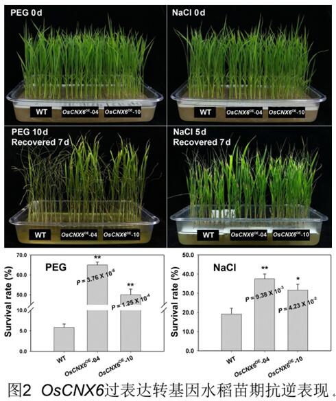 东北地理所水稻分子育种学科组方军博士前期通过大规模的筛选,获得一系列水稻穗发芽突变体,并克隆了其中的PHS1-PHS4 和PHS8基因(Plant J, 2008、Plant J,2018)。本次研究证明了MoCo合成基因OsCNX1 和 OsCNX6的突变最终导致了穗发芽及纯合致死。OsCNX6 编码MoCo合成蛋白2大亚基,该基因的突变导致黄嘌呤脱氢酶(XDH)、醛氧化酶(AO)、硝酸还原酶(NR)及亚硫酸盐氧化酶(SO)等四种钼酶活性显著降低。通过分析基因表达模式,表明OsCNX6在水稻的叶片、茎秆、胚乳等部位均有表达。进一步过量表达该基因的转基因水稻没有出现不利的农艺性状,而植株对渗透和盐胁迫的抗性有了显著提高。这一研究不仅揭示了MoCo合成基因对水稻生长发育的重要作用,同时也为水稻抗逆育种提供了新的研究思路和视角,具有重要的理论和应用价值。
