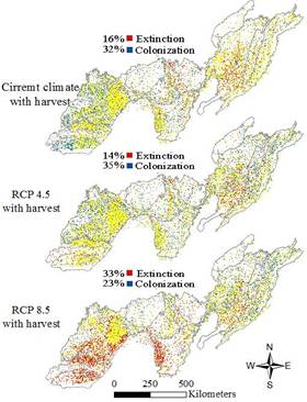 研究发现大部分的北方、广分布及少数南方树种的分布面积将缩减,大部分的南方树种的分布面积将扩张;种群动态是影响树种分布变化最重要的过程;在短期和中期,采伐的作用比气候变化的作用大,但在长期,气候变化的作用比采伐的作用大,采伐和气候变化有交互作用,采伐将加速由气候变化导致的分布面积缩减(特别是北方树种)和分布面积扩张(特别是南方树种);树种生物属性如繁殖能力、成熟时间、扩散能力对未来树种分布变化起到很重要的作用。该研究强调了在气候变化下,种群动态和采伐对提高未来树种分布预测起到很重要的作用,在理论上把影响树种分布的多尺度过程纳入对气候变化响应的预测,完善了树种分布预测的模型理论,提高了预测的真实性;在应用上为资源管理和物种保护提供理论基础,也为制定适应气候变化的策略提供科学支撑。