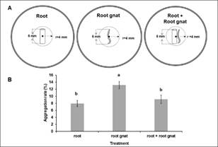 图2 EPN对寄主韭蛆和寄主栖境韭菜根单独及其互作的集聚反应