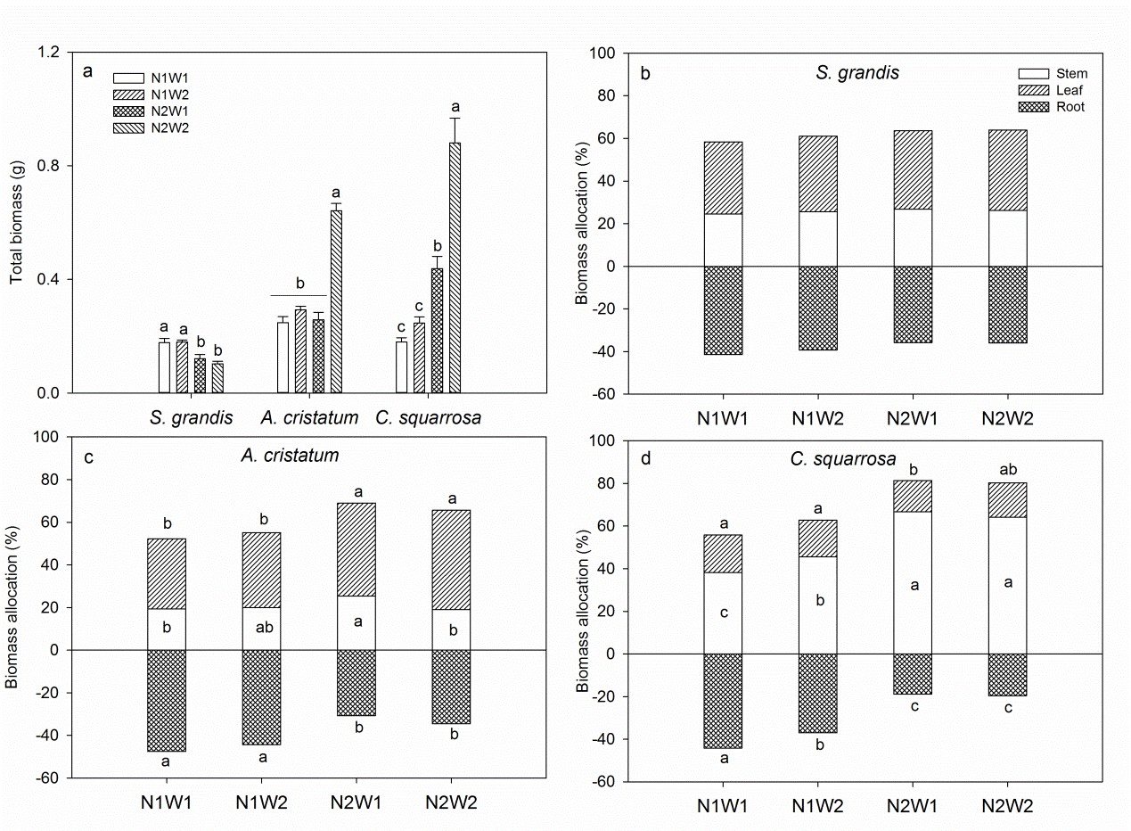 图1 三个物种总生物量(a)和茎、叶、根生物量分配(%,b-d)对水氮添加的响应。N1W1,低氮低水;N1W2,低氮高水;N2W1,高氮低水;N2W2,高氮高水。