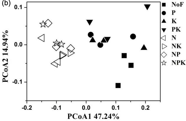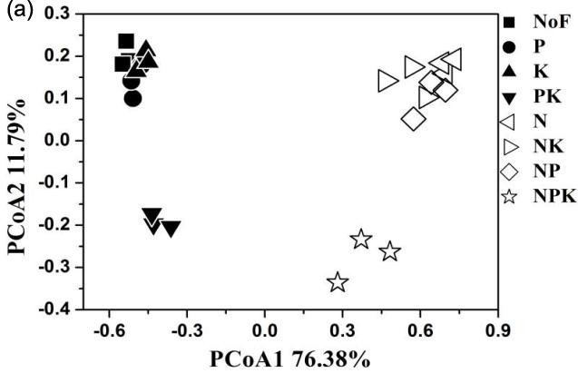 图1不同化肥处理对农田黑土细菌群落(a)和固氮菌群落(b)结构影响的PCoA分析