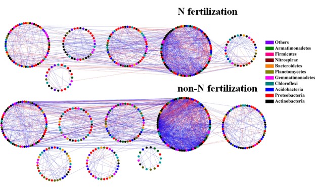 图2不同化肥处理农田黑土细菌群落(a)和固氮菌群落(b)分子生态网络图,每个节点代表1个OTU,也就是相应的细菌/固氮菌物种;不同颜色的节点表示不同优势细菌/固氮菌类群;蓝色线代表物种间的正相关关系,红色线代表物种间的负相关关系