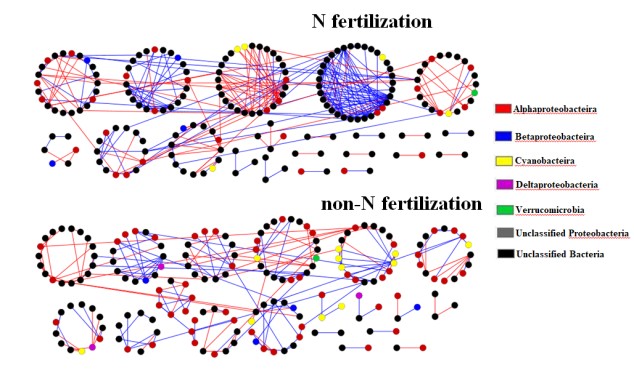 长期以来,化肥施用作为一种主要的农业措施在提高农作物产量上具有显著成效,但诸多研究表明长期的化肥施加可导致土壤有机质下降、土壤氮流失加重、土壤大面积酸化以及农产品中重金属超标等问题,同时也会改变土壤微生物群落结构。然而,对于不同种类化肥的施加对微生物群落结构的影响有何异同,尚缺乏系统性的研究。为此,东北地理所农田分子生态学科组与黑龙江省农业科学院土壤肥料与环境资源研究所合作,以长期不施肥(NoF)、单施氮肥(N)、单施磷肥(P)、单施钾肥(K)、氮磷肥(NP)、氮钾肥(NK)、磷钾肥(PK)和氮磷钾混合肥(NPK)为研究对象,利用新一代高通量测序技术和分子生态网络分析,分别对上述不同化肥添加下农田黑土细菌和固氮菌群落结构进行解析。结果表明含有氮肥处理(N、NP、NK和NPK)和非氮肥处理(NoF、P、K、PK)的细菌群落和固氮菌群落均明显分成两大集团(图1),其中放线菌门(Actinobacteria)、变形菌门(Proteobacteria)和酸杆菌门(Acidobacteria)是主要的优势细菌门,慢生根瘤菌属(Bradyrhizobium)和斯科曼氏球菌属(Skermanella)是主要优势固氮菌属;含氮肥和非氮肥处理的细菌和固氮菌分子网络结构也存在明显差异(图2)。网络属性分析发现,含氮肥的细菌网络和非氮肥的固氮菌网络虽然结构简单但更稳定。土壤pH、全氮和速效钾是调控细菌网络的主要因子;土壤pH、全碳、全氮和硝态氮是影响固氮菌网络的主要因子。上述结果综合表明,在长期施加不同化肥组合处理中,含氮化肥的施加是驱动东北农田黑土细菌和固氮菌群落结构分异的主导因素。