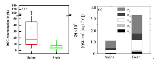 图1青藏高原湖泊DOC分布图; a. 淡水湖与咸水湖DOC对比分析, b. 淡水湖与咸水湖CDOM组分标准化参数φi对比分析