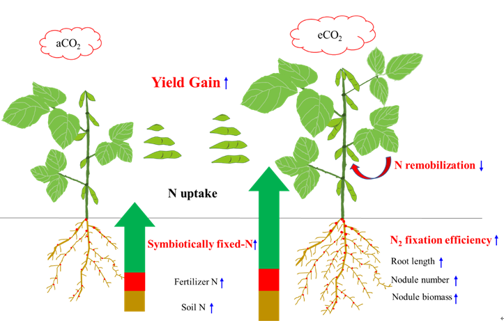 大气CO2浓度不断升高是全球气候变化的重要环境因子,根据计算大气CO2浓度已从工业革命前的270 ppm升高到目前的412 ppm(http://scrippsco2.ucsd.edu/#),预测到本世纪中叶大气CO2浓度将升高到550 ppm,本世纪末达到700 ppm。研究发现大气CO2浓度升高促进C3作物生物量提高,即肥料效应(CO2fertilization effect),但会导致植株氮(N)浓度降低,进而抑制产量的持续增加。大豆是对CO2浓度升高响应最敏感的作物之一,由于其本身具有共生生物固氮能力,理论上大气CO2浓度升高可能显著改变N吸收模式,进而影响CO2肥料效应。