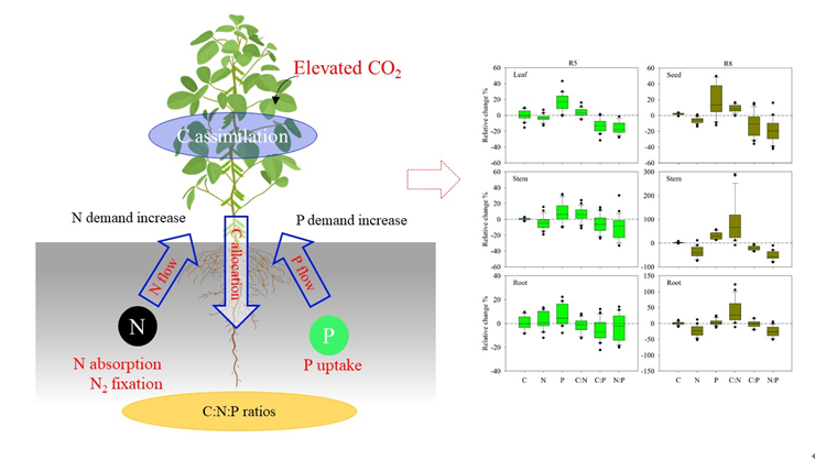 东北地理所农田分子生态学科组李彦生助理研究员和金剑研究员等利用开顶式气室(Open Top Chamber, OTC)模拟大气CO2浓度升高到550ppm,采用稳定同位素15N标记方法,选取黑龙江省主栽品种,量化分析了大气CO2浓度升高条件下共生固氮、土壤氮和肥料氮对大豆产量形成的贡献。研究发现,高浓度的CO2显著增加了大豆植株中N吸收量,这主要与大豆共生生物固氮贡献提高有关(图1)。大气CO2浓度升高条件下,大豆根瘤数量和质量均显著提高。揭示高CO2浓度条件下大豆R5期(鼓粒期)至R8期(成熟期)共生生物固氮的增加与产量提高显著相关(P< 0.05)。从植株C、N和磷(P)的化学计量学角度进一步证实大气CO2浓度升高显著增加大豆不同组织的C:N比,但降低N:P比,提出N是限制黑土区大豆对大气CO2浓度升高响应重要元素,而不是P,大豆固氮能力可能是决定未来大豆产量稳定性的重要因素(图2)。