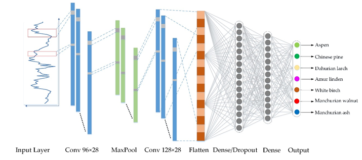 研究人员首次将我国自主生产的高光谱遥感影像数据OHS-1应用于优势树种分类研究,发挥其高光谱分辨率(2.5nm)和高空间分辨率(10m)的优势,同时,引入深度学习算法(一维深度卷积神经网络模型Conv1D),在有限的样本数据条件下,选择光谱特征和树冠纹理特征(熵和均值)作为分类特征参数,通过优化卷积核大小及卷积层数等参数的设置,实现了东北长白山典型森林样区优势树种的高精度识别。基于地面调查样点的精度验证结果表明,深度学习模型的总体分类精度(85.04%)高于随机森林模型(80.61%),尤其是对于光谱特征相似的阔叶树种(如核桃楸和白杨),深度学习模型的自动识别精度(87.15%)显著高于随机森林模型(71.77%)。因此,基于卷积的深度学习框架结合高光谱影像数据能够有效提高树种分类的准确性,具有广阔的应用前景。