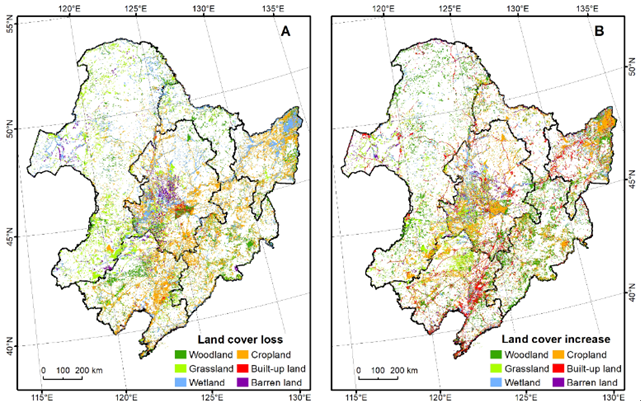 理解生态系统服务的时空变化特征是生态系统可持续管理的重要前提。探讨政策影响下的土地覆盖变化及其对生态系统服务的影响,有助于理解区域生态变化特征,对优化和制定区域可持续发展管理决策具有重要的科学指导意义。东北地区作为我国北方重要的生态安全屏障及重要的商品粮生产基地,研究其土地覆盖格局及生态系统服务的变化,能够有效支撑“美丽中国”和“生态文明”的建设。