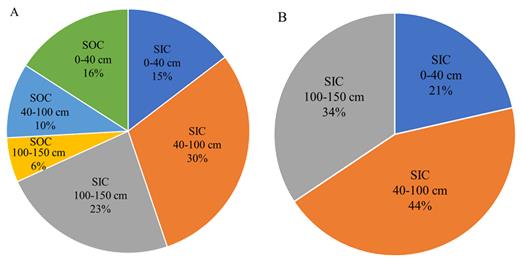 图1土壤碳不同形态(A)和土壤无机碳(B)在土壤剖面的分布