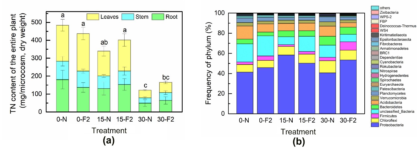 研究表明,人工湿地接种外源耐盐脱氮菌Alishewanella sp. F2后,含盐废水中氮的去除率和人工湿地整株植物的氮吸收量显著提高,当进水电导率(EC)为15 mS/cm时,微生物强化的人工湿地对氨氮和总氮的去除效率(95.7%和99.4%)显著高于对照组(68.5%和76.4%)。高通量测序发现,耐盐脱氮菌Alishewanella sp. F2不仅增加了人工湿地中其他土著脱氮功能菌的丰度,有效缓解了盐胁迫对微生物脱氮功能的抑制效应;还增加了根际促生菌等土著微生物的丰度,进而提高了人工湿地植物的生长能力及整株植物氮吸收量。因此,接种外源耐盐脱氮菌Alishewanella sp. F2同步提升了人工湿地中微生物和植物的活性,从而提高了盐胁迫条件下人工湿地的脱氮效率。本研究为人工湿地高效去除含盐废水中含氮污染物提供了一种新的解决方案,有利于拓宽人工湿地在水处理中的应用领域,同时对深入理解外源微生物与土著微生物交互作用提供了有力证据。
