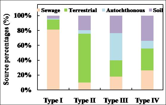 河流水体DOC的来源主要包括内源和外源2个部分,土壤有机质的侵蚀、陆生植物残体以及人类生产、生活活动排放的有机物等是外源有机碳的主要来源;而内源DOC主要源于河流中植物叶绿体光合作用、细菌及其分泌物等。中国海河流域工农业发展迅速,河流水体污染现象严重,中国科学院东北地理与农业生态研究所水环境遥感学科组的科研人员对海河流域水体进行了野外调查采样,基于三维荧光技术和稳定同位素分析技术解析了河流水体中DOC来源:1)受蒸发作用影响,海河流域河水中春季DOC浓度明显高于秋季(p < 0.01),但春季DOC中陆源组分比例明显低于秋季;2)海河流域河流水体中DOC主要来源于陆源物质,主要包括生活污水(9.8%-81.2%)和陆生植物残体(13.3%-65.8%);3)按照海河流域河水中DOC的主要来源可将河水分为4个类型:I型河水,DOC主要来自生活污水(81.2%);II型河水,DOC主要来自陆生植物残体(65.8%);III型河水,DOC主要来自土壤有机质(36.4%);IV型河水,DOC主要来自浮游生物(33.9%)(图1)。本研究结果进一步掌握了河流水体中有机碳的组成、含量及来源等,有助于加深对河流水体有机碳循环生物地球化学过程的理解,为进一步开展河流水体有机碳循环研究工作奠定坚实基础。