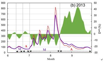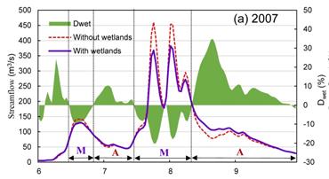 图1典型枯水年(a)和丰水年(b)湿地对径流的调节作用