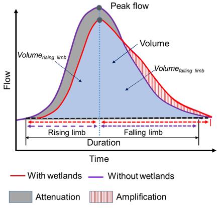 面向湿地恢复保护的国家需求和湿地生态水文学研究的国际前沿,东北地理所水文与水资源学科组在了解和掌握湿地生态水文模型研究动态及发展趋势的基础上,发现国际上流域水文模型缺乏对湿地水文过程及其与流域水文过程互馈作用的定量描述,难以用于流域湿地水文功能定量评估,通过与加拿大国立科学研究院合作,在嫩江流域构建了耦合湿地模块的嫩江流域水文模型,并对多种湿地分布情景下流域水文过程进行模拟,定量评估了流域湿地径流调节、维持基流和洪水调蓄等水文功能。研究结果表明:流域湿地具有显著的径流调节能力, 体现在对总径流的削弱作用和对径流机制(流量、频率、历时和发生时间等)的改变作用(图1);湿地对总径流、快径流和基流的影响效应和强度具有明显的月、季节和年尺度变化特征,总体上发挥着削减洪峰和维持基流的作用。嫩江流域湿地发挥着显著的洪水调蓄作用(图2),体现在对洪峰流量、洪水期间平均流量和和洪量的削减作用(图3);流域湿地洪水调蓄功能的强度和效应具有明显的时空差异性。