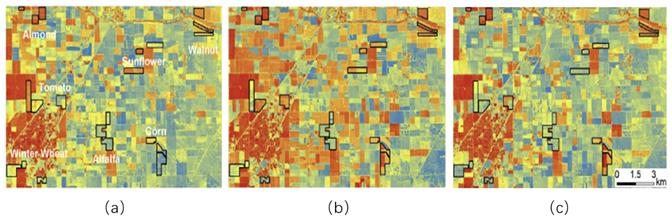 基于全极化UAVSAR数据,研究人员计算得到全年Cloude–Pottier以及Freeman–Durden极化参数,并利用极化参数及原始的雷达后向散射系数(HH,HV,VV)对农作物全年生长动态进行了监测。研究结果表明,常绿作物(例如果树)及饲料作物(例如苜蓿草)整个生长季后向散射值十分稳定,而冬小麦及夏季大田作物则变化剧烈,表现为从出芽阶段到生物量峰值时段的快速上升,以及随后到衰老阶段的急速下降。整体上,6月和10月影像上极化信号异质度很高,而7-8月份信号均质度很高。