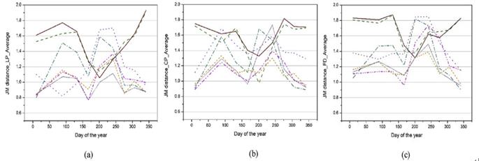 图2. 每种作物与其它作物间的全年平均JM距离值变化图 (a) 原始后向散射系数(HH, HV, VV), (b) Cloude-Pottier极化参数, (c) Freeman-Durden极化参数.