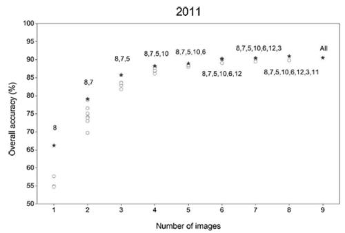 图3. 基于前向影像选择方法得到的最优遥感影像组合产出的分类精度变化图