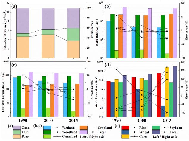 图1 1990-2015年三江平原生态系统服务变化:不同等级生境适宜性面积(a)、主要土地覆被类型的水源涵养(b)、主要土地覆被类型的生态系统碳储量(c)、粮食产量(d)