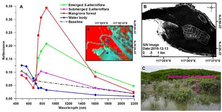 图1 淹没互花米草指数(SAI)建立的基础。(A) 水面以上的互花米草、淹没互花米草、红树林和水体光谱反射率曲线以及建立SAI的基线;(B)高潮期SAI影像;(C)淹没互花米草的野外照片。