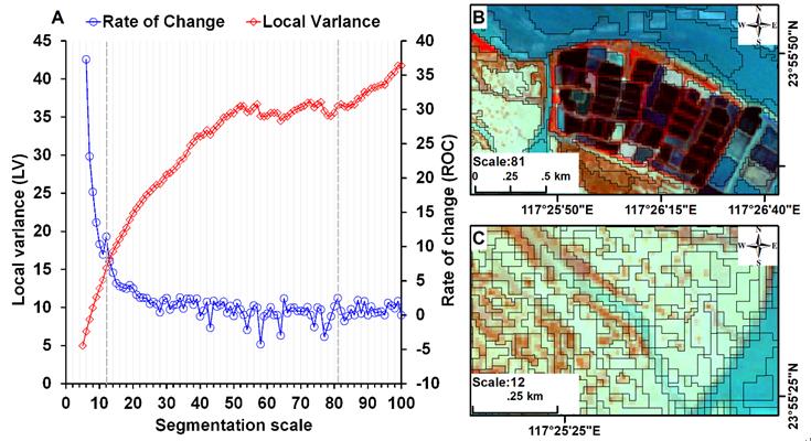 图2不同对象的最佳分割尺度。(A)局部方差(LV)和变化率(ROC) 随分割尺度增加的变化;(B)分割尺度为81的分割效果;(C)分割尺度为12的分割效果。