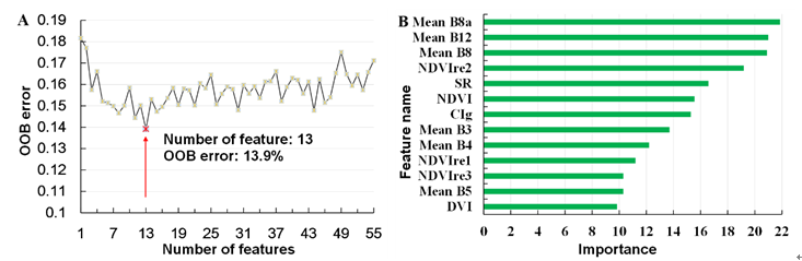 然后,研究人员采用面向对象的随机森林分类方法对2016-2018年研究区互花米草的进行解译。为了量化影像中不同目标的最佳分割尺度,研究人员使用了尺度参数优化工具(ESP)来确定分割效果是否最优(图2),并在随机森林分类过程中选取最优特征参数(图3)。通过对结果进行精度评价显示,互花米草的解译精度达到92%以上。