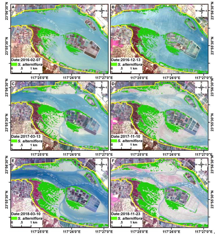 分析互花米草的空间分布(图4)发现:互花米草主要分布在红树林周围, 2016-2018年,互花米草斑块聚集性增强。对互花米草的面积变化进行分析发现:互花米草在2016年2月至2018年11月急剧扩张,从151.7公顷增加到270.3公顷,扩张比例达78%,年入侵率为39.5公顷。互花米草在生长期和休眠期都存在入侵现象,在生长期的入侵率为31.5公顷/季节,在休眠期的入侵率是12.1公顷/季节。与先前漳江口地区互花米草入侵研究结果进行对比,发现,近年来互花米草的入侵进程明显加快。对互花米草的入侵过程进行季节性分析,为生态学家和环境管理者了解互花米草的入侵机制提供了新的视角。[3] [n4]