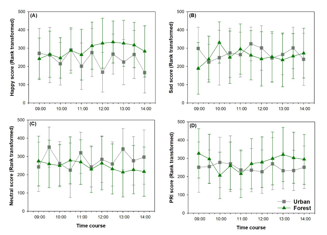 图2. 参与者面部开心(A)、悲伤(B)、木讷(C)和乐观积极表情(B)的秩排序动态在城市森林与附近街区之间的差别。