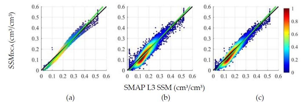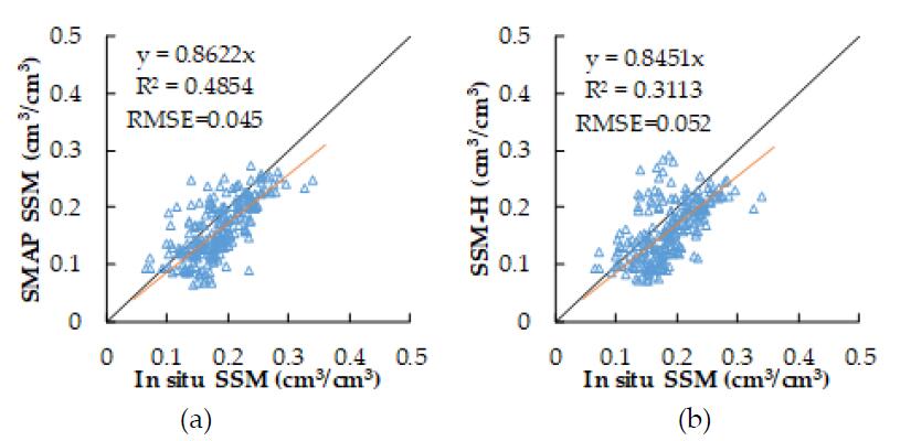 图1 本研究估算土壤水分与SMAP L3土壤水分产品对比结果。(a)V极化, (b) H极化,(c)H和V极化