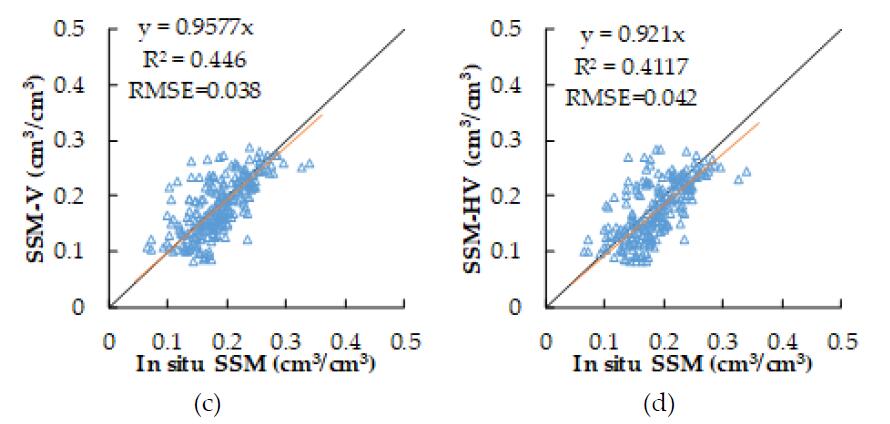 图2 本研究估算土壤水分与野外实测土壤水分的对比结果。(a) SMAP L3 产品,(b) H极化,(c) V极化, (d) H和V极化