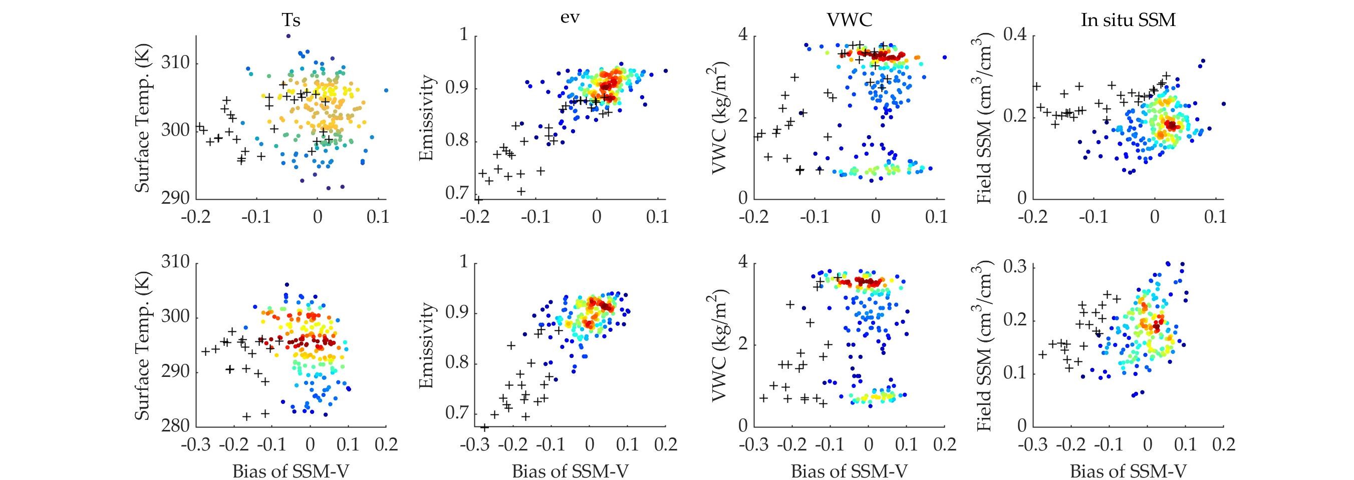 图3 本研究估算土壤水分对输入参数的误差依赖性,"+"号表示日降水超过10毫米。