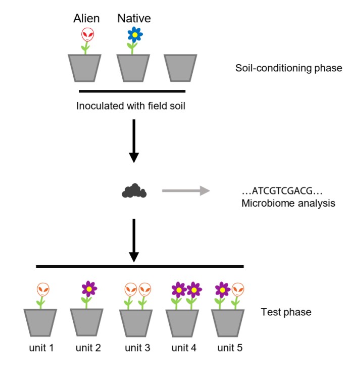 外来入侵生物造成的生态破坏与经济损失使得我们急需探究外来种成功入侵的原因。长久以来,高竞争能力一直被认为是外来种成功入侵的关键。但是过去的研究大多关注两物种竞争(一个本地种与一个外来种的竞争),很少探究多物种的竞争。此外,竞争有不同的类型,被广泛研究的是对资源的竞争,但是竞争也可以通过其它营养级产生。因此,中国科学院东北地理与农业生态研究所生物入侵生态学研究团队与德国康斯坦茨大学生态学研究团队通过实验旨在研究第三个物种是否会通过改变土壤微生物来改变外来种和本地种的竞争结果。
