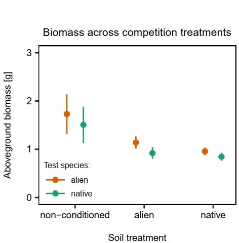 图2 土壤驯化对外来植物(橘色)和本地植物(紫色)平均生物量的影响。 高平均生物量代表更高竞争能力。在外来植物驯化的土壤上,后来的外来植物平均生物量高于后来的本地植物。