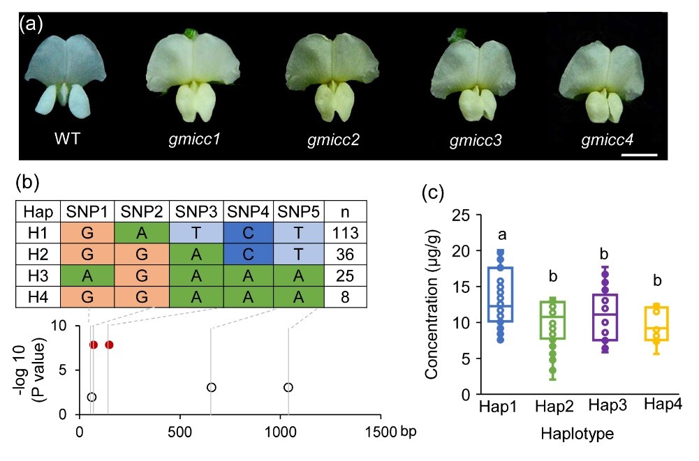 图 1(a)4个大豆花色变黄且类胡萝卜素含量升高的gmicc突变体株系(b)大豆存在4种GmCCD4的单倍体型(c)不同单倍体型中的类胡萝卜素含量存在显著差异