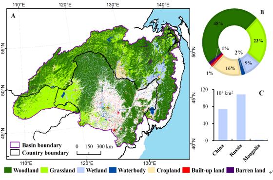 图 黑龙江流域土地覆被空间格局及不同国家湿地分布情况