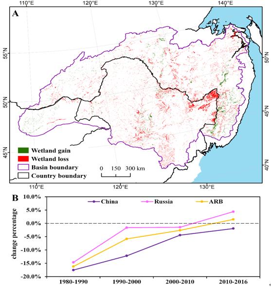 研究将面向对象和层次决策树(HOHC)的分类方法应用于长时间序列的Landsat影像,获得了1980至2016年间5个年份的土地覆盖数据集。通过对湿地分布、变化及类型转化分析发现,2016年黑龙江流域湿地面积为18.5万 km2,占整个流域土地面积的9%。其中,俄罗斯一侧的湿地占流域湿地总面积的59%,中国一侧为40%,蒙古为1%。近40年间,黑龙江流域共损失了22%的湿地面积,1980-2010年间呈现持续净损失,但2010-2016年间面积有所增加。人类活动主导了黑龙江流域中国一侧湿地的持续损失,其中耕垦直接占用是湿地损失的最主要因素;建设用地扩张也在不断的占用湿地,且占用量持续增加。相反,俄罗斯一侧的湿地在1980-2010年间持续减少,在2010-2016年间呈现增加趋势,主要归因于气候变湿驱动草地和林地向湿地的转化。