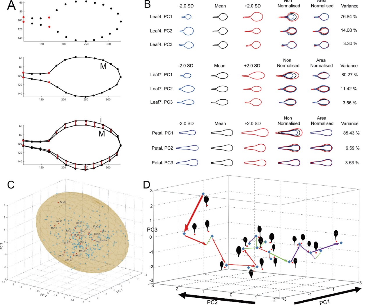 A.描述叶片和花瓣形态的点模型;B.拟南芥MAGIC群体中叶片和花瓣形态模型的PCA分析;C.MAGIC群体器官形态的异速生长空间;D.不同叶片形态的最优设计路线,不同颜色的箭头表示不同PC的QTL位点。
