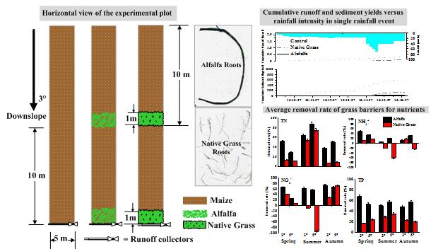 东北黑土区是中国重要的粮食核心产区和最大的商品粮生产基地,由于坡地被大量垦殖,水土流失逐年加剧,造成了严重的农业面源污染。目前采用的最佳管理措施(BMPs),如垄作区田、地埂、鱼鳞坑等,多以水土保持为目标进行设计,对于污染的削减主要通过大量拦截泥沙、径流来实现。这些措施可能造成上游来水锐减,影响下游河流和湖库的水生态质量,尤其是在水源地流域,入库径流的减少可能造成水质进一步恶化、供水保证率降低,给下游居民的生产、生活用水带来困难。为此,东北地理所水环境污染与防治学科组科研人员研发了新型等高植物草篱技术,并利用在吉林省辽源市东辽县杏木国家级水土保持示范园区内的标准小区,开展了草篱污染物削减能力实地监测与模型模拟验证工作。
