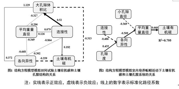 长期定位试验结果表明保护性耕作显著增加了土壤蚯蚓数量。保护性耕作土壤平均重量直径和连接性与土壤有机碳呈正相关关系,保护性耕作可以通过不同的路径增加团聚体结构稳定性和孔隙连接性,进而增加土壤有机碳(图1)。培养实验结果发现,添加蚯蚓对土壤CO2排放无显著影响,但添加秸秆后显著增加土壤CO2排放,并且新添加的秸秆在传统耕作和保护性耕作中具有相同的分解速率。与传统耕作相比,蚯蚓活动有利于保护性耕作下黑土有机碳的积累,同时增加了土壤孔隙度、大孔隙平均直径,降低了100-500μm的孔隙数量。结构方程模型模拟得出,保护性耕作下蚯蚓通过影响土壤孔隙度进而影响土壤有机碳含量, 同时得出传统耕作下添加秸秆则可以通过提高土壤团聚体稳定性来增加土壤有机碳含量(图2)。