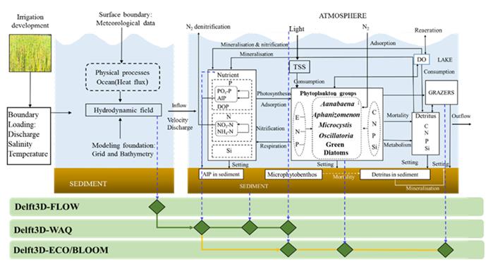 为此,东北地理所水文与水资源学科组科研人员在揭示查干湖水循环机理及水质演变规律的基础上,基于综合模型数据库和Delft3D平台,将BLOOM模块嵌套入传统的生态模型(图1),构建了查干湖水动力-生态模型(图2)。相比于传统的水华模型,本研究中构建的综合模型刻画了功能群和表征型水平上浮游植物的竞争机制(图2),量化了营养盐浓度(TN和TP)、总悬浮颗粒(TSS)和氮磷比(N:P)等多环境因子对浮游植物竞争机制的影响。研究结果表明:TSS是限制查干湖浮游植物生物量的主控因子,有利于驱动优势种向蓝藻(Anabaena, Microcystis, Aphanizomenon 和 Oscillatoria)演替,尤其在浑水阶段(TSS>60 mg/L)。当N:P超过20时,非固氮蓝藻比例(i.e., MicrocystisandOscillatoria)超过固氮蓝藻的比例(i.e., AnabaenaandAphanizomenon)。在较高的TSS浓度和较弱的光照强度环境下,非固氮蓝藻占主导;在清水阶段(TSS≤60 mg/L),较低的N:P比和较强的光照强度环境下,固氮蓝藻占主导(图3)。营养盐的绝对浓度限制了浮游植物的生物量,而营养盐的相对浓度决定了浮游植物的演替,其中光能为植物生长和演替过程中发生的生化反应提供主要的能量支撑。最终,提出了维持查干湖水生态系统健康的营养盐和TSS浓度阈值范围(TN ≤ 1.5 mg/L; TP ≤ 0.1 mg/L; 15 ≤ N:P ≤20; and TSS ≤ 60 mg/L)。该研究揭示了多环境因子协同作用下查干湖浮游植物之间的竞争机制,可为湖泊水质改善和水生态修复提供科学支撑。