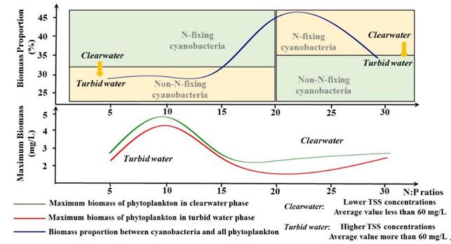 图3 清水和浑水状态情景下查干湖浮游植物最大生物量以及蓝藻生物量占比随氮磷比的动态变化