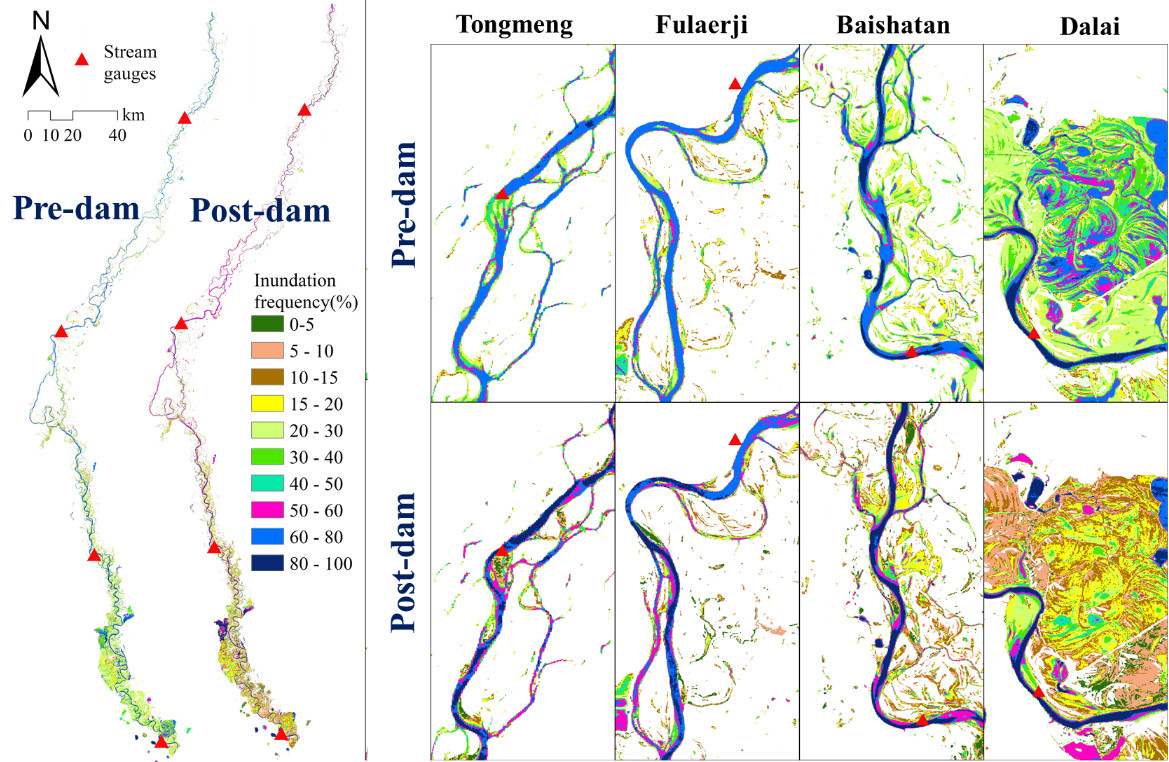 河滨湿地在维系流域水安全和生态安全等方面发挥着极为重要作用。水库大坝在为全球社会经济发展起到重要支撑作用的同时,也对河滨湿地生态系统施加了巨大的干扰,是引起河滨湿地面积萎缩、功能退化甚至丧失等的主要因素之一。洪水脉冲在维系河滨湿地生态系统健康中发挥着极为重要的作用。如何从洪水脉冲视角定量揭示水库大坝对下游河滨湿地的影响成为湿地退化水文学机制研究的关键科学问题。为此,东北地理所水文与水资源学科组科研人员选择嫩江尼尔基水库下游为研究区,基于多情境下河滨湿地—河道水文交互过程模拟和遥感淹没分析,定量阐明了水库大坝建设对下游河滨湿地淹没频率和洪水脉冲强度的影响,并提出了维持河滨湿地生态健康的洪水脉冲机制可为流域湿地水文调控和水资源调度提供重要理论支撑。