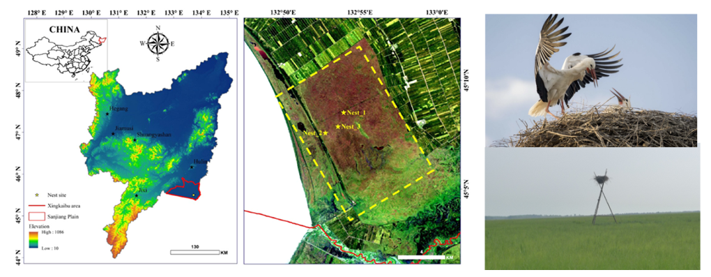 生物多样性保护对策的科学制定与动物“行为生态学”密切相关,传统捕获动物行为的望远镜观察法和瞬时扫描法无法采集到高时频、高定位的精准信息,制约着“行为生态学”的深入发展。卫星跟踪技术由于具有定位准、时频高、记录连续且时序长、省人省力、数据实时传输等优点,近年被广泛用于湿地水鸟的“行为生态学”研究中。然而,目前有关湿地水鸟跟踪研究主要关注迁徙、觅食过程及相关生境保护,忽视了繁殖地幼鸟离巢前的保护对整个种群维持的重要性,尤其缺乏系统探讨大型濒危水鸟幼鸟离巢前的昼夜活动节律、热点分布模式和家域范围等行为生态学特征。东方白鹳(Ciconia boyciana)被世界自然保护联盟(IUCN)列为红色名录濒危物种,是湿地生态系统的旗舰物种,在四月初抵达我国东北的三江平原地区,栖息于大块湿地景观斑块内,并选择人工鸟巢开始繁殖(图1)。随着人类活动和气候变化胁迫的日益加剧,东方白鹳的繁殖地生境逐渐萎缩,种群多样性维持遭到严重威胁,亟需提出匹配于幼鸟行为特征和生境需求的针对性保护策略,加强种群保护。
