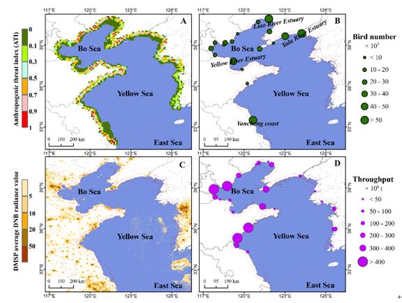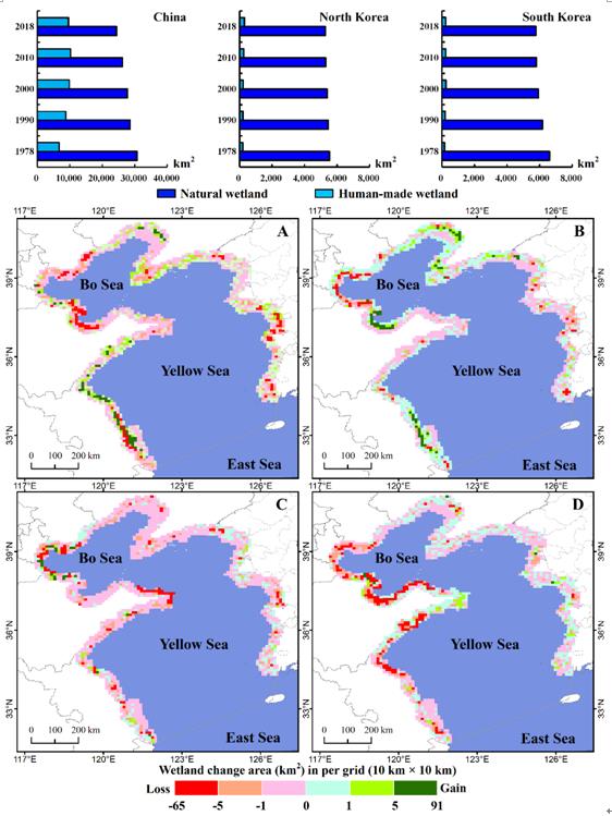 东亚-澳大利西亚水鸟迁徙廊道是全球最大的水鸟迁徙路径之一,其中环黄渤海湿地是最为重要的栖息生境,对于迁徙水鸟的保护具有重要的作用。环黄渤海地区,地跨朝鲜半岛西海岸和中国江苏启东市以北长度超过1万公里的海岸线,是东北亚地区经济快速发展的重点区域之一,因此区域湿地和迁徙水鸟受人为胁迫干扰严重。准确理解湿地分布范围、变化趋势和主要驱动因素对于保护湿地生态系统和生物多样性等具有重要的科学意义和社会价值,是学术界重点关注的热点话题。然而,环黄渤海地区长时间序列湿地生境及其人为胁迫的跨境对比分析方面仍存在明显的不足。