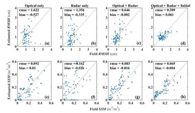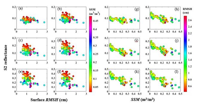 雷达具有穿云透雾、全天候全天时工作的特点,被认为是全球或区域尺度获取土壤水分时空变化的最佳手段。在实际应用中,雷达信号受土壤含水量、植被含水量、土壤质地、土壤表面粗糙度等多因素影响。对于裸露土壤表面,表层土壤水分和表面粗糙度是影响雷达信号的主要因素,为了实现裸土表面的高精度土壤水分估算,东北地理所微波遥感团队开发了一种联合光学和雷达数据同时估算土壤含水量(SSM)和表面粗糙度(RMSH)的方法,以减弱表面粗糙度对SSM反演结果的影响。图1为表面土壤水分和地表粗糙度对光谱反射率的影响,图2为表面土壤水分和地表粗糙度对后向散射系数的影响。研究团队构建了土壤含水量、表面粗糙度与光谱反射率(与雷达后向散射系数)之间的半经验关系,利用偏最小二乘法同时估算了土壤水分和表面粗糙度。在此基础上,通过引入土壤水分和表面粗糙度初始值,限制土壤水分和表面粗糙度的值域,避免SSM和RMSH估计值陷入局部最优解,进一步提高了反演精度(图3)。