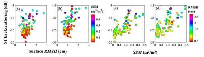 图2. Sentinel-1后向散射系数与SSM和RMSH的关系。