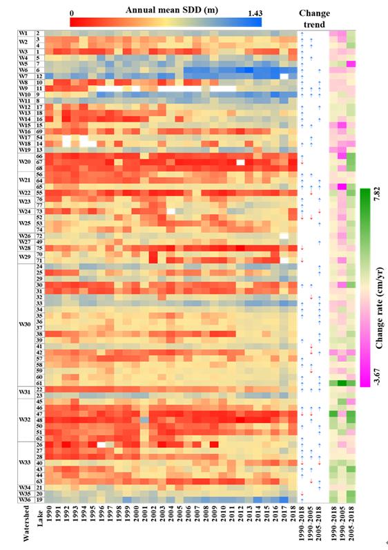 透明度,作为一种最直观地反映水体光学特性的指标之一,常被用来监测水体的质量状况。该指标能够揭示水体的透明程度和浑浊度,也能够综合地反映水体生态系统的营养状态。遥感技术手段的出现,使得大范围监测湖库透明度变化成为可能。遥感反演透明度的算法主要包括三种:分析算法,半分析算法和经验算法。其中经验算法被广泛地用来反演不同区域尺度透明度变化。以往研究学者对松花江流域透明度的遥感监测时段主要集中在2000年以后,且侧重透明度反演算法的研究。因此,中国科学院东北地理与农业生态研究所水环境遥感学科组的科研人员们基于2004-2017年实测湖库透明度数据和GEE云计算平台,运用经验算法开展了遥感反演松花江流域77个湖泊透明度的长时间序列(1990-2018年)动态变化研究。结果发现,2005年以来松花江流域的湖库水质得到改善。具体来说,2005-2018年松花江流域的年均透明度表现为上升的趋势(p<0.05),从0.29米增加到0.37米。而且,从1990-2005到2005-2018,透明度表现为上升趋势的湖泊个数由18个增加到31个(图1)。通过影响因素贡献率分析,发现用于农业生产的化肥对湖库透明度年际变化的贡献率最大,其次是废水排放和植被覆盖(NDVI)。进一步分析,得出松花江流域水质改善的原因主要包括两方面,一是废水排放的处理能力和数量有了很大提高,二是植被覆盖有了很大改善。但是,农业的非点源污染对松花江流域的湖库水质影响仍然存在,在将来仍然需要对湖库的水质改善继续做出努力。