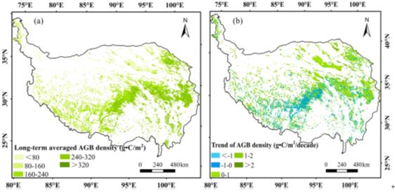 图1 2000-2019年青藏高原沼泽湿地植被地上生物量密度多年平均及变化趋势