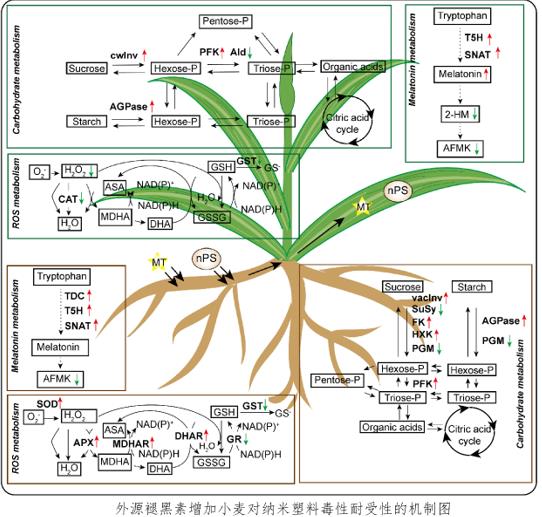 东北地理所作物生理与栽培学科组研究人员以小麦为研究对象,针对褪黑素影响聚苯乙烯纳米微粒吸收、转运及生理作用进行了研究。借助激光共聚焦和扫描电镜观察发现,聚苯乙烯纳米微粒可以被小麦根系吸收,并且当小麦根系暴露于褪黑素和聚苯乙烯纳米微粒的混合溶液中时,小麦叶片和根系中聚苯乙烯纳米微粒的积累量减少。RT-qPCR分析表明,外源褪黑素能够调节叶片中水通道蛋白相关基因TIP2-9、PIP2、PIP3和PIP1.2的表达以及根系中TIP2-9、PIP1-5、PIP2和PIP1.2的表达。针对褪黑素处理减少聚苯乙烯纳米微粒对小麦影响的生理机制,研究人员从内源褪黑素代谢、碳水化合物代谢、活性氧代谢等三个方面对暴露于聚苯乙烯纳米微粒的小麦叶片和根系进行进一步的分析。结果表明,施加的外源褪黑素参与小麦植株对聚苯乙烯纳米微粒的响应,但不依赖于内源褪黑素代谢;同时,外源褪黑素施加还可以通过改变多种抗氧化酶活性(包括CAT、GST、APX、MDHAR、DHAR、GR和SOD)维持聚苯乙烯纳米微粒造成的氧化胁迫下小麦的氧化还原稳态平衡,并且通过改变碳水化合物代谢水平,保证小麦生长所需的物质和能量供应,从而增强植株对聚苯乙烯纳米微粒毒性的耐受性。