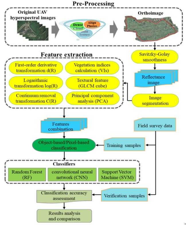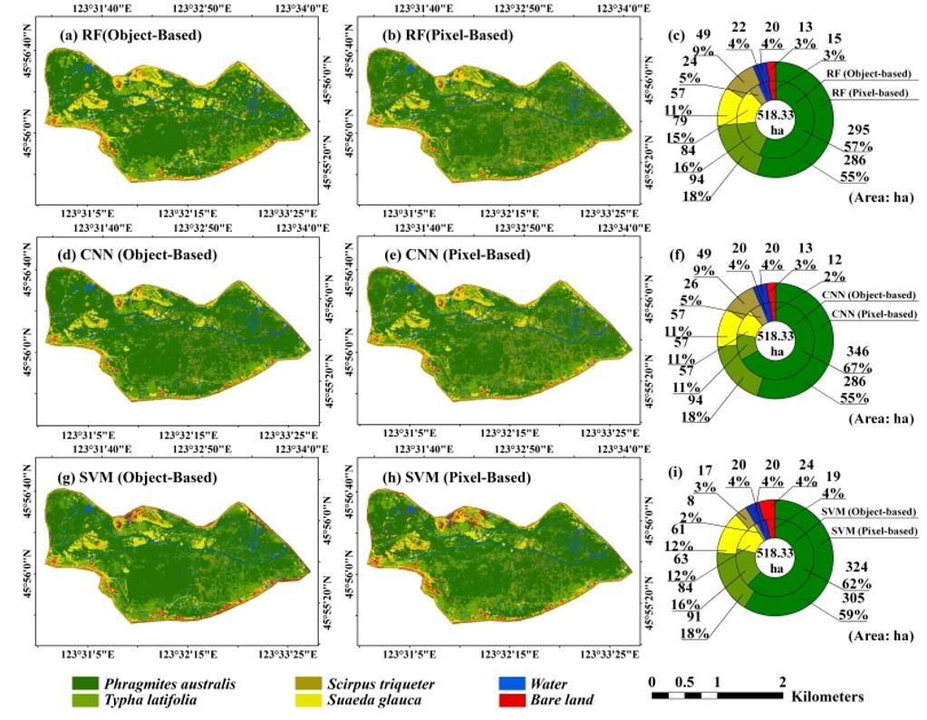 地理景观遥感学科组研究人员利用无人机遥感的优势,集成高光谱成像和机器学习技术,实现了莫莫格核心区湿地植物群落的遥感分类制图。通过对高光谱数据的多种变换构建最优特征波段子集,对比了基于面向对象和像元的三种机器学习相结合的6种分类方法的精度,成功实现莫莫格湿地核心区的湿地植物群落分布的精细制图。研究发现:基于面向对象+随机森林的方法得能够更准确地刻画湿地植物群落边界,提取精度最高达87.75%;莫莫格核心区域的芦苇群落和香蒲群落面积分别为295 ha(57%)和84 ha(16%)。