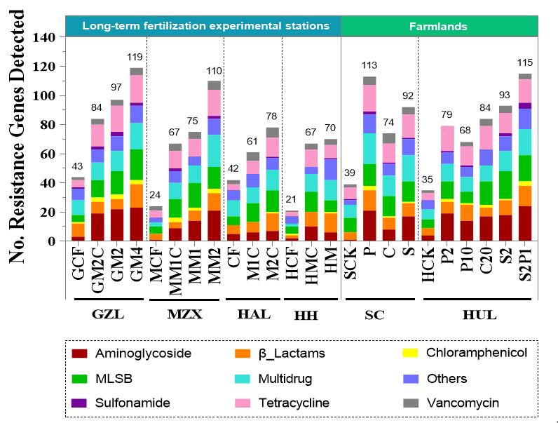 图1施肥制度对东北黑土农田ARGs数目的影响。样品采自公主岭(GZL)、哈尔滨民主乡(MZX)、海伦(HAL)和黑河(HH)的长期定位施肥试验,以及双城(SC)和呼兰(HUL)的野外农田。GCF、MCF、CF、HCF、SCK 和 HCK 表示不同地点单施化肥对照处理;M表示施用有机肥,MC表示化肥配施有机肥;野外农田中的P、C和S分别代表施用鸡粪、牛粪和猪粪;符号后面的阿拉伯数字代表用量(定位试验)或施用年限(野外农田)