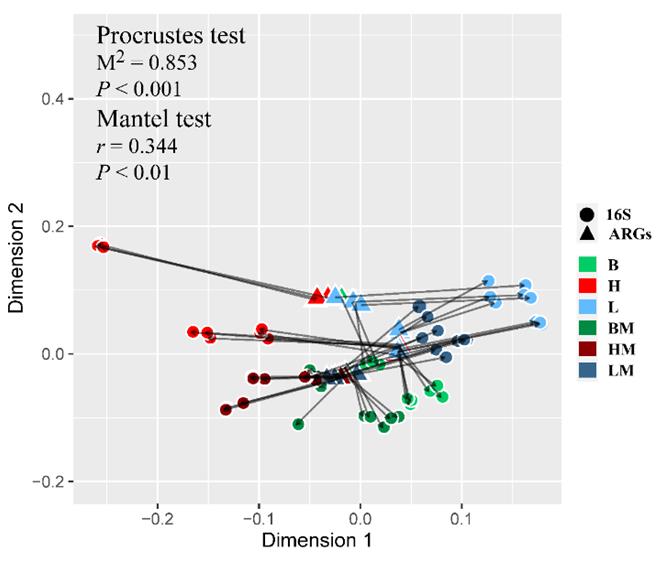 图2普氏分析(Procrustes)显示出ARGs组成与细菌群落之间具有显著的相关性。B、H和L分别代表取自北安(有机质含量高)、海伦(有机质含量中)和梨树(有机质含量低)的黑土;M表示添加鸡粪处理
